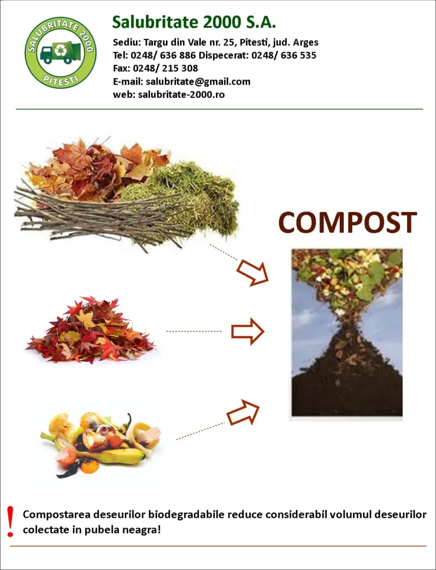 Piteștenii care nu depozitează deșeurile vegetale în curțile proprii în vederea compostării pot solicita colectarea acestora de către Salubritate 2000 S.A. gratuit, în limita a cinci saci de 120 litri.