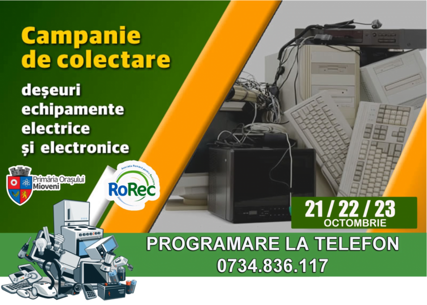 În Mioveni va fi organizată o nouă acţiune de colectare a deşeurilor electrice şi electronice (DEEE). Acţiunea face parte din campania naţională”Locul deșeurilor nu este în casă!”.Astfel, în zilele de 21, 22 și 23 octombrie 2021, cetățenii din Mioveni sunt invitaţi să se debaraseze de obiectele electronice și electrocasnice vechi sau defecte.Intervalele orare de colectare a acestor deșeuri vor fi următoarele: 9.00-13.00 în orașul Mioveni și 17.00-20.00 în cartiere.