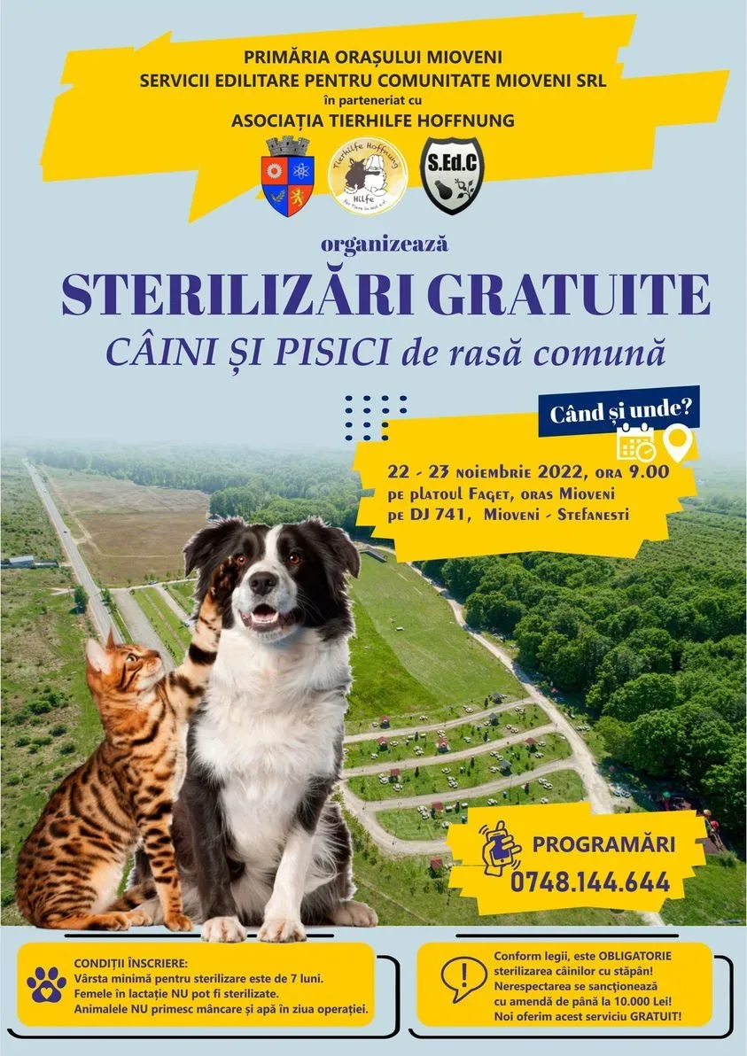 În perioada 22-23 noiembrie se va derula o nouă campanie de sterilizare gratuită a câinilor și pisicilor de rasă comună, cu sau fără stăpân.