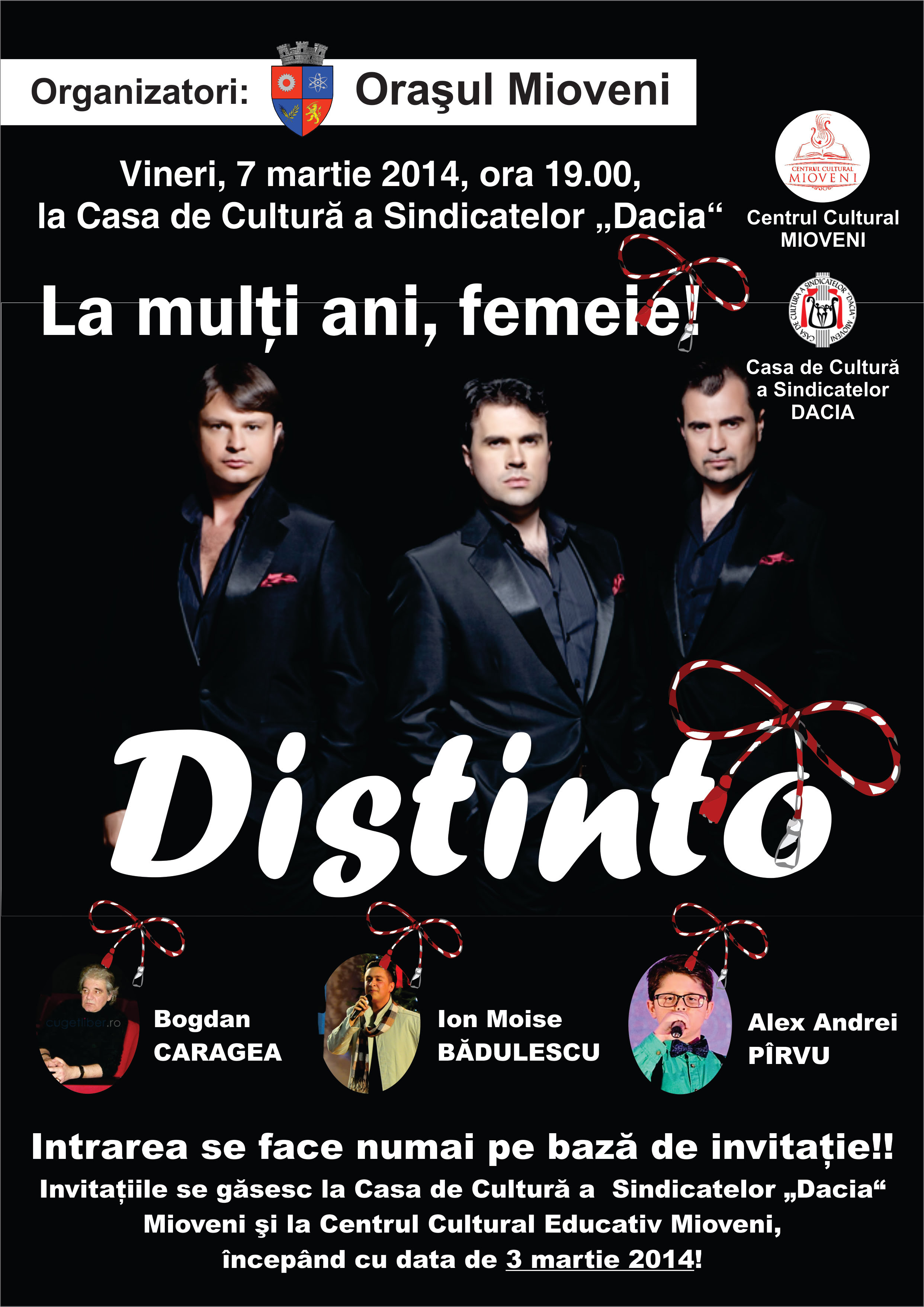 Orașul Mioveni, Centrul Cultural în parteneriat cu Casa de Cultură a Sindicatelor Dacia organizează vineri, 7 martie 2014, ora 19.00, cu ocazia Zilei Internaționale a Femeii un spectacol susținut de trupa DISTINTO una dintre cele mai interesante trupe muzicale românești, Bogdan Caragea, Ion Moise Bădulescu și Alex Pîrvu în sala de spectacole a Casei de Cultură a Sindicatelor Dacia.Intrarea se face numai pe bază de invitație! Acestea se găsesc la Centrul Cultural Educativ și la Casa de Cultură a Sindicatelor Dacia Mioveni.