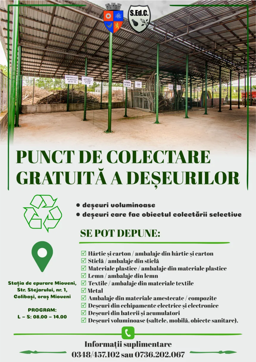 Deșeurile provenite din construcții, precum și cele vegetale (chiar dacă provin din gospodărie) nu fac obiectul campaniei noastre – pentru ridicarea acestora puteți contacta o firmă autoizată pentru transportul și colectarea acestui tip de deșeu. Pentru depunerea deșeurilor, cetățenii sunt așteptați la punctul de colectare de la Stația de epurare, Str. Stejarului, nr. 1, cartier Colibași, oraș Mioveni. Identificarea cetățenilor care transportă și predau deșeuri în punctele de colectare separată a deșeurilor se face în baza cărții de identitate. Informații suplimentare vor fi oferite la dispeceratul nostru la tel: 0348/457.102 sau 0736.202.067, transmite Servicii Edilitare pentru Comunitate Mioveni.