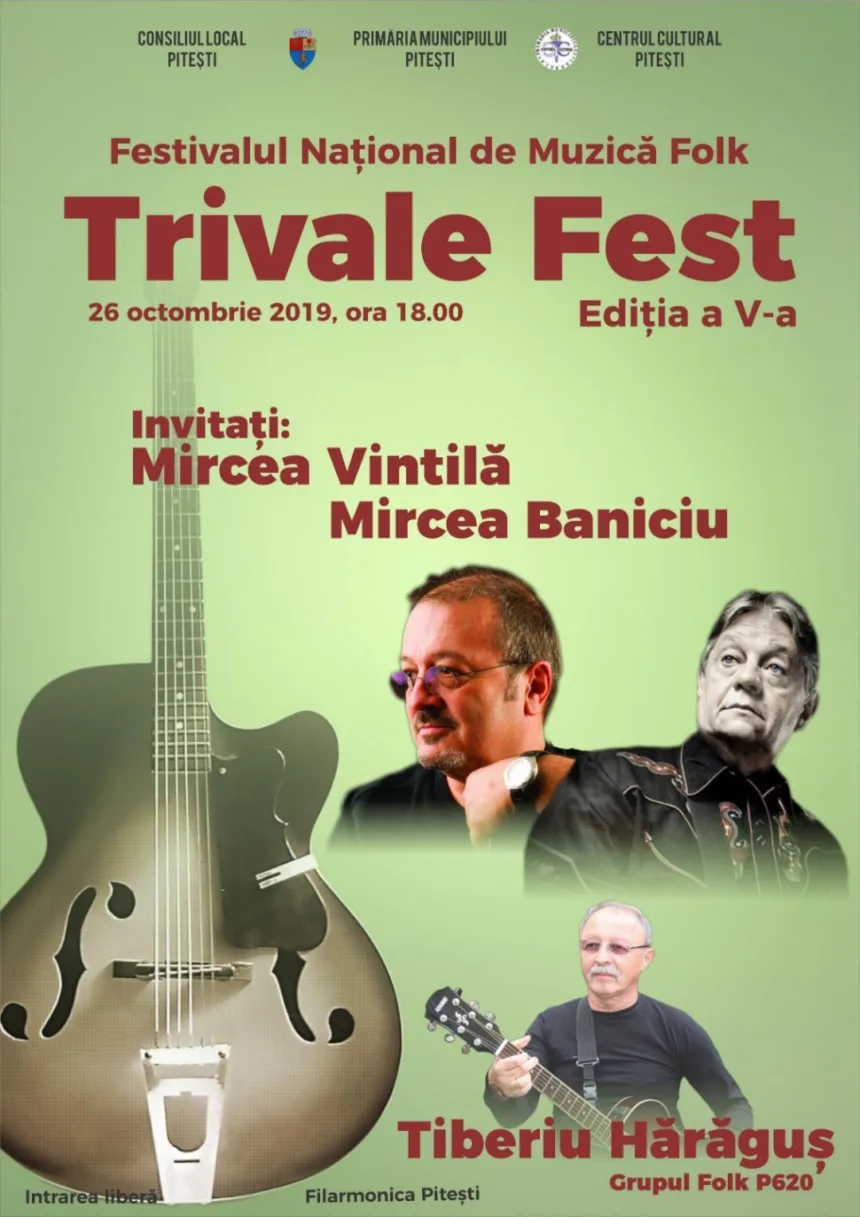 octombrie, de la ora 18.00, la sediul Filarmonicii Pitești, va cuprinde un concurs de interpretare și recitaluri extraordinare, susținute de Mircea Vintilă, Mircea Baniciu, Tiberiu Hărăguș și Grupul Folk P620. Intrarea este liberă, în limita locurilor disponibile! Evenimentul, aflat la a V-a ediție, este organizat de Primăria Municipiului Pitești și Consiliul Local, prin Centrul Cultural Pitești.