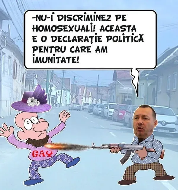 „Să le fie de bine. Să facă ce vor ei și toți românii să audă că vor să susțină homosexualii din România. Este extraordinar, mie îmi face o reclamă de nu mai pot. Eu îi apăr împotriva homosexualilor pe toți românii din țara asta, 87% credincioși, cu familii. Eu vreau ca în țara asta familia să fie din bărbat și femeie. Restul nu mă privește. Nu pot să-mi ia niciodată credința mea, concepția mea, Pro Democrația sau o minoritate de homosexuali. E treaba lor cum vor să trăiască, dar niciodată nu vor putea să îmi impună mie, în viața vieților lor, să fac eu cum vrea o minoritate, am trăit în familia mea românească, tradițională, cu bunic preot”, a declarat joi, pentru MEDIAFAX, deputatul PSD Cătălin Rădulescu.(ziarele) Caricatura de Mihai Matei pentru www.argesplus.ro