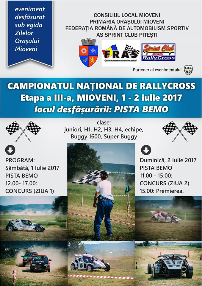 Consiliul Local Mioveni, Primăria orașului, Federația Română de Automobilism Sportiv, Asociația Sportivă Sprint Club în parteneriat cu Servicii Edilitare pentru Comunitate Mioveni, organizează în perioada 1-2 iulie, cea de-a III-a etapă din cadrul Campionatului Național de Rallycross. Competiția națională va avea loc pe pista Bemo din Mioveni și va strânge la start 25 de echipaje din București, Brașov, Târgu Jiu, Târgu Mureș, Pitești și Mioveni. Clasele de concurs sunt – juniori, H1, H2, H3, H4, echipe, Buggy 1600, Super Buggy.