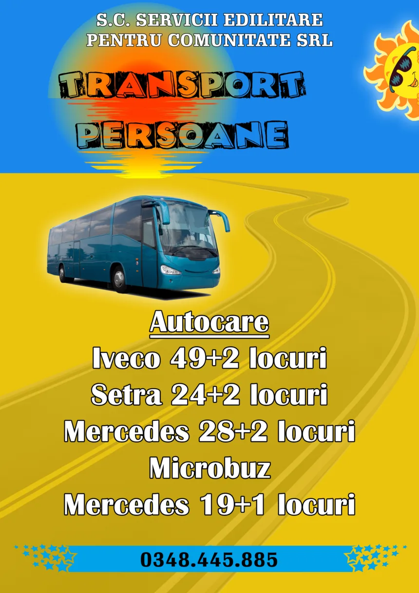 Este sezonul vacanțelor, al excursiilor. Servicii Edilitare pentru Comunitate Mioveni vine în ajutorul dumneavoastră și vă pune la dispoziție, contra cost, mijloace de transport pentru efectuarea de curse intern și internațional. Climatronic, cu minibar, frigider, scaune confort, având personal cu vastă experiență în transport, autocarele noastre vă asigură un nivel ridicat de confort și siguranță.