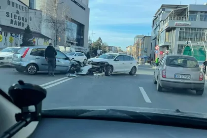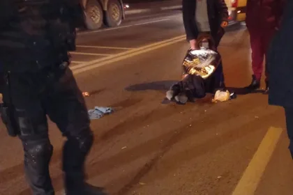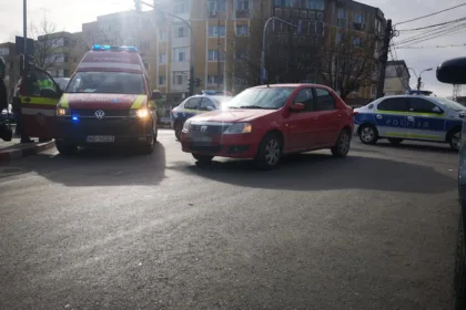 Femeia accidentată în această dimineață, ajutată de un polițist. Acesta se întorcea acasă după tura de noapte